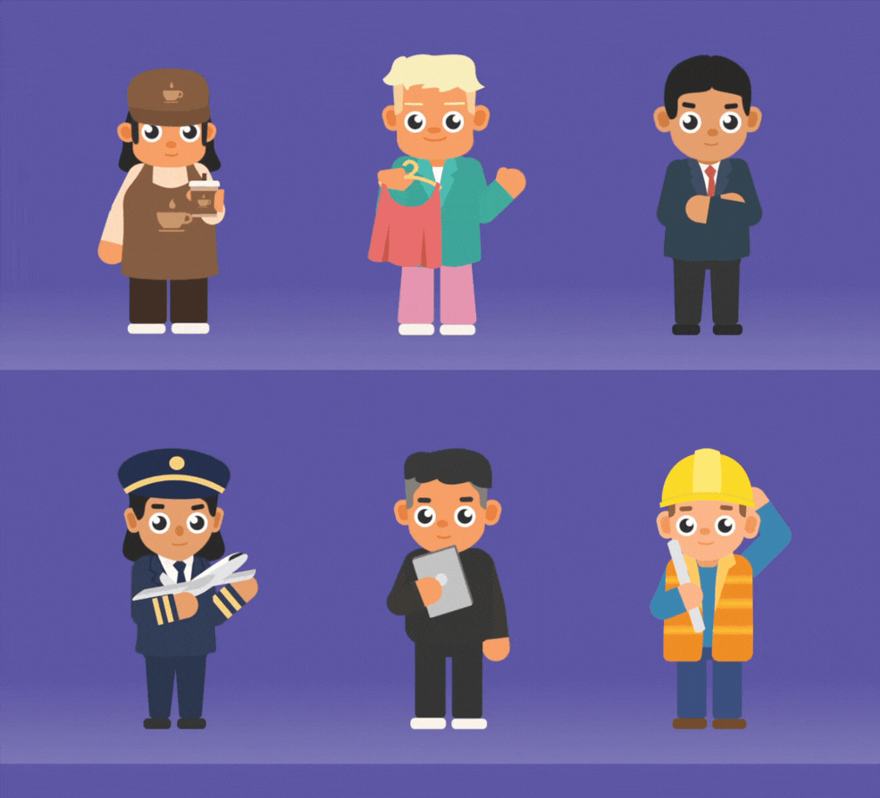 Characters inclusive by intent Diversity across ethnicity, gender, and background was a design requirement, not an afterthought — stereotypes were to be actively broken. Four musician friends in Level 1, four tech company CEOs in Level 2, twelve sector clients across Level 3. All characters were designed with distinct personalities and animated to bring them to life.