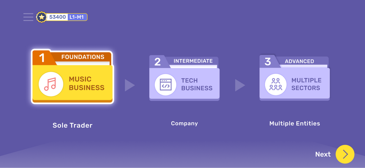 Making accounting feel like a game worth playing The design challenge wasn't decoration — it was architecture. XP on every screen, a strict linear unlock system, a visible journey map, and a long-term reward that accumulates across the arc. The content didn't change. The frame around it did.