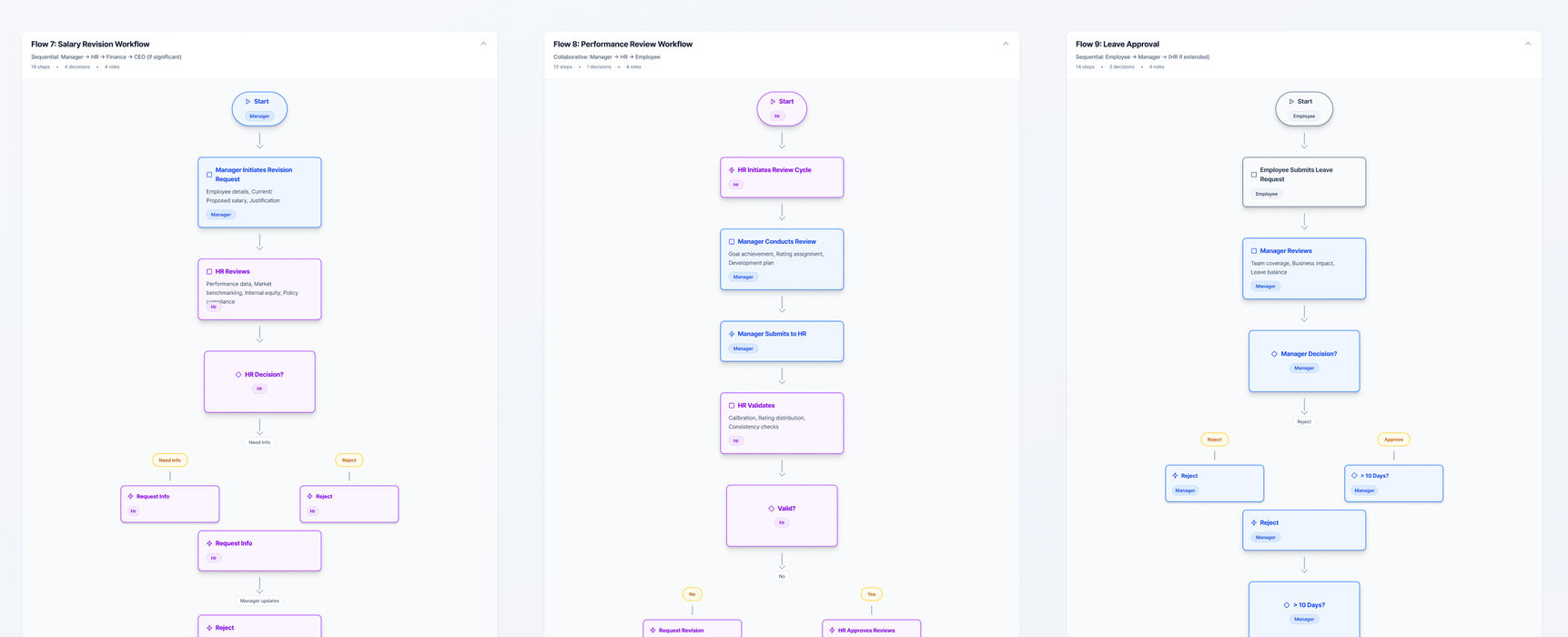 Multi-stakeholder approval chains, query resolution states, and permission boundaries worked through with AI before design began
